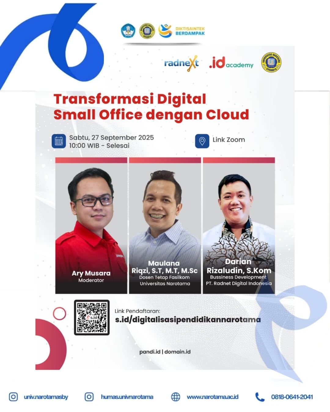 Universitas Narotama (UN) Surabaya melalui Fakultas Ilmu Komputer kembali menampilkan inovasi digital yang inspiratif. Dalam webinar (27/9/25) bertajuk “ Transformasi Digital Small Office dengan Cloud”, Dosen Fakultas Ilmu Komputer, Maulana Rizqi, S.T., M.T., M.Sc, berbagi pengalaman membangun sistem cloud pribadi ( private cloud) untuk........